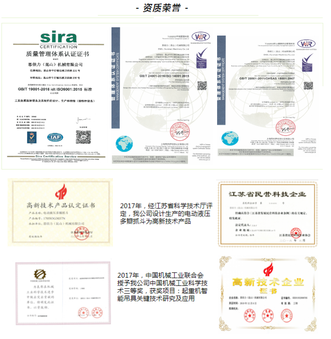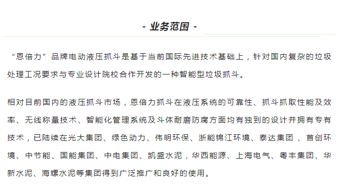 公司地处江苏经济最活跃的前沿——昆山市沿沪产业带,占地面积约25亩,注册资金5000万人民币,主要业务是以“ENBL”专有技术及对应的生产工艺,专业制造各类电动液压抓斗、机械抓斗、工程液压抓斗、特种疏浚抓斗以及用于固定物料搬运的专用吊夹具。用户遍及港口、冶金、火力发电、生物质发电及垃圾处理等散货物料储运行业,赢得了良好的市场信誉。