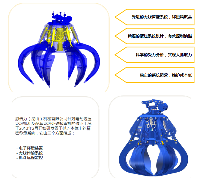 恩倍力(昆山)机械有限公司是现代经营管理模式下的一家新型企业,于2013年在江苏昆山合资成立了集抓斗(具)的设计、制造与销售为一体的专业制造企业,公司通过资源整合集聚该领域的专业人才,凭借江苏已趋规模的专业制造优势及成熟的长三角配套资源,专业承接抓斗(具)从设计、制造到技术支持的全方位服务。