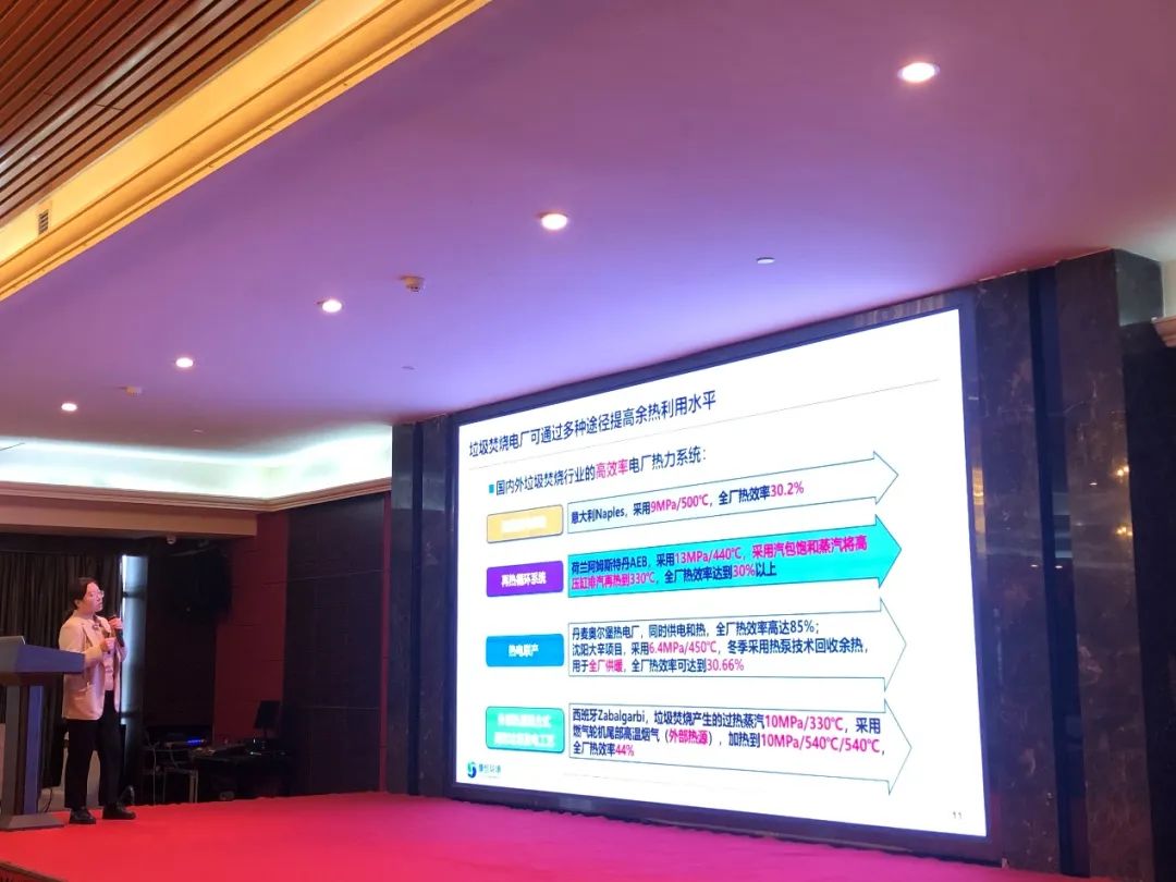 上海康恒环境股份有限公司主任研究员黄一茹结合河北三河项目千吨级炉排、高参数、炉外除湿耦合蒸汽再热发电、热力系统优化、能量梯级利用的有关实践情况,对提高热效率的措施进行了分享与交流。